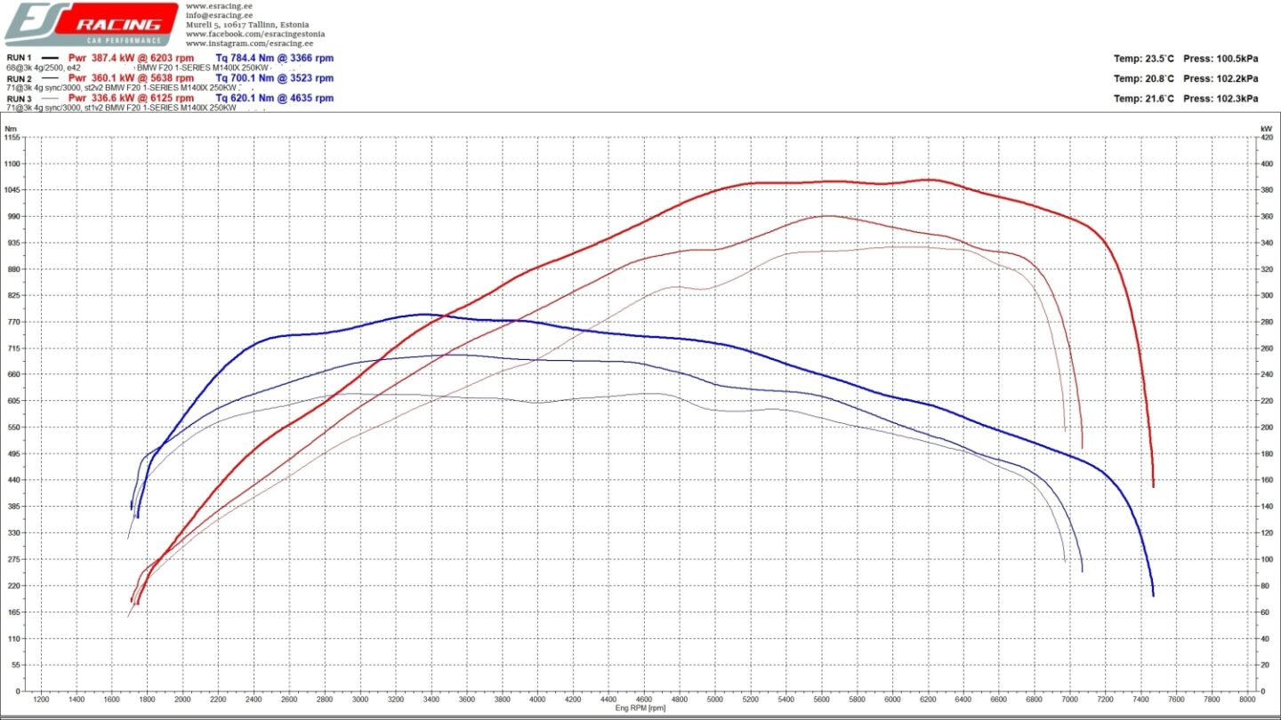 - Stage2+. Lisaks eelnevale vaja paigaldada Flex Fuel kit ning tuningu aluseks kasutada MHD patchiga mootori tarkvara. Kütus ron98 ja e30-40%, mootori seadistamine dünos 2 kütuse tüübiga. Tänu FlexFuel kiti integratsioonile suudab aju peale seadistamist automaatselt tuvastada kütuse tüübi ning muuta mootori seadistuse parameetreid vastavalt sellele. See on ühtlasi ka maksimum, mis on võimalik võtta originaal turboga ja TU kõrgsurve kütusepumbaga. Mõõdetud tulemus dünos 387kW ja 784Nm (graafik #2 RUN1), mõõdetud jõulisa võrreldes originaaliga +126kW ja +259Nm.