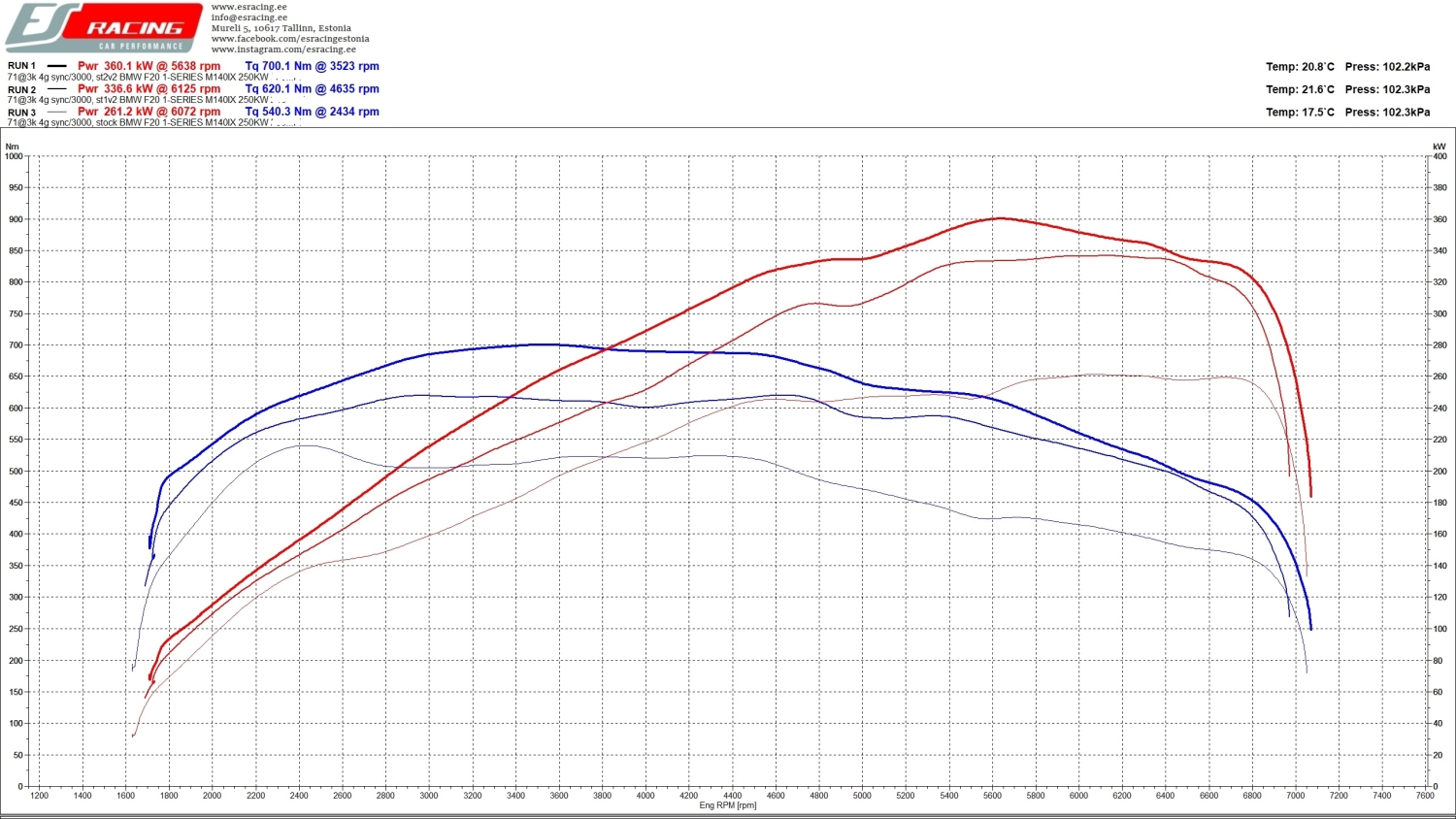 - Stage2. Vajalikud järgmised raua modifikatsioonid – kõrgsurve kütusepump, downpipe (sport katalüsaatoriga või ilma katalüsaatorita). Soovi korral võib paigaldada lisaks ka KN paneel õhufiltri, hot climate kiti ja charge pipe kiti. Bensiin ron98, mootori tarkvara seadistamine dünos. Mõõdetud tulemus dünos 360kW ja 700Nm (graafik #1 RUN1), mõõdetud jõulisa võrreldes originaaliga +99kW ja +175Nm.