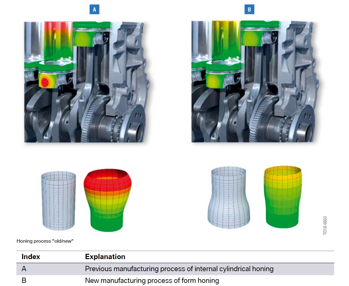 BMW on läinud B58TU, ehk gen2 mootori silindritega veel kaugemale. Nimelt, mootori töö käigus silindrid termo-paisuvad ülemises osas rohkem. B58TU silindrite hoonimine on tehtud selliselt, et külmalt on silindrite läbimõõt silindri alumises osas suurem, kui ülemises (vt pilti). Mõõdu erinevus on arvestatud selliselt, et normaalse töötemperatuuri juures oleks silinder võimalikult täpselt silindrilise kujuga. See omab positiivset mõju heitgaasi kvaliteedile, õli ja kütuse kulule, mootori jõudlusele ja kulumisele.