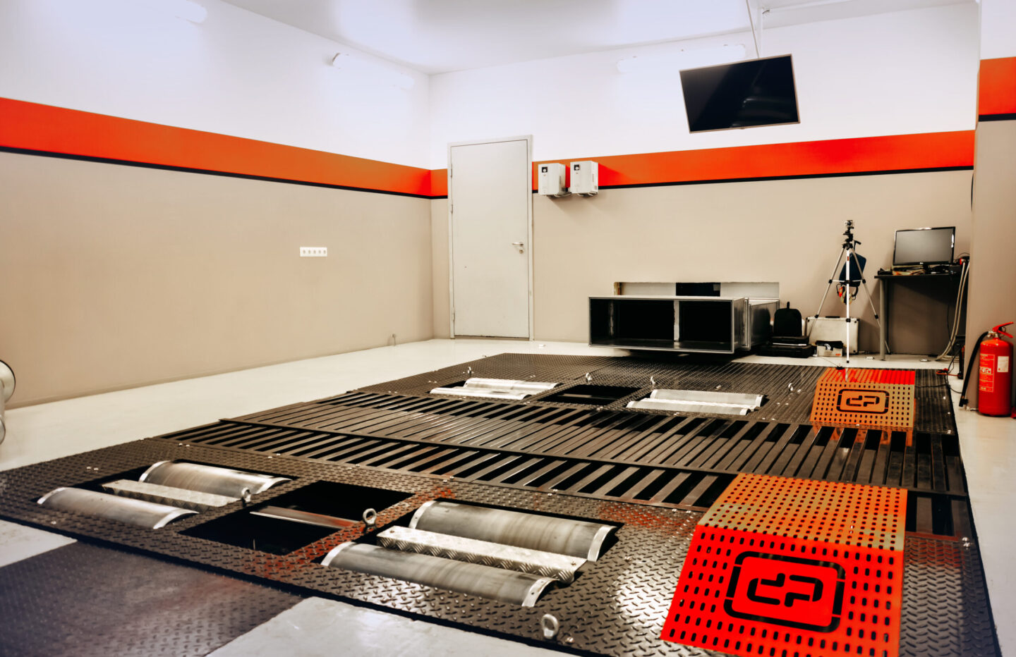 Düno raami oleme paigaldanud põranda sisse, mis tagab suurema turvalisuse, kasutusmugavuse ning võimaldab lihtsama vaevaga saada peale ka väga madalad autod. Lisaks oleme teinud düno alla kanali, et vajadusel saaks minna auto alla ning väga võimsate autode puhul teha lisakinnitused alla suunas.