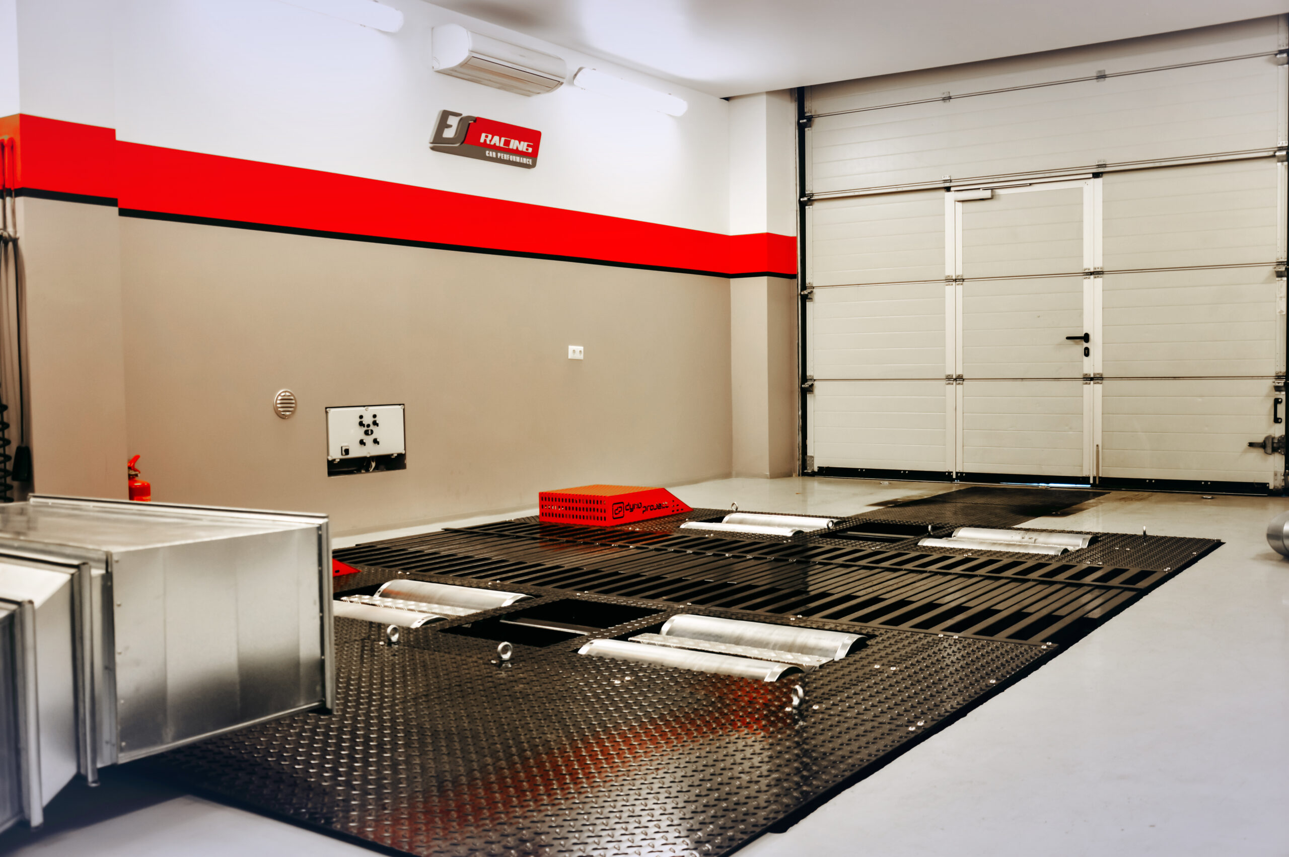Düno raami oleme paigaldanud põranda sisse, mis tagab suurema turvalisuse, kasutusmugavuse ning võimaldab lihtsama vaevaga saada peale ka väga madalad autod. Lisaks oleme teinud düno alla kanali, et vajadusel saaks minna auto alla ning väga võimsate autode puhul teha lisakinnitused alla suunas.