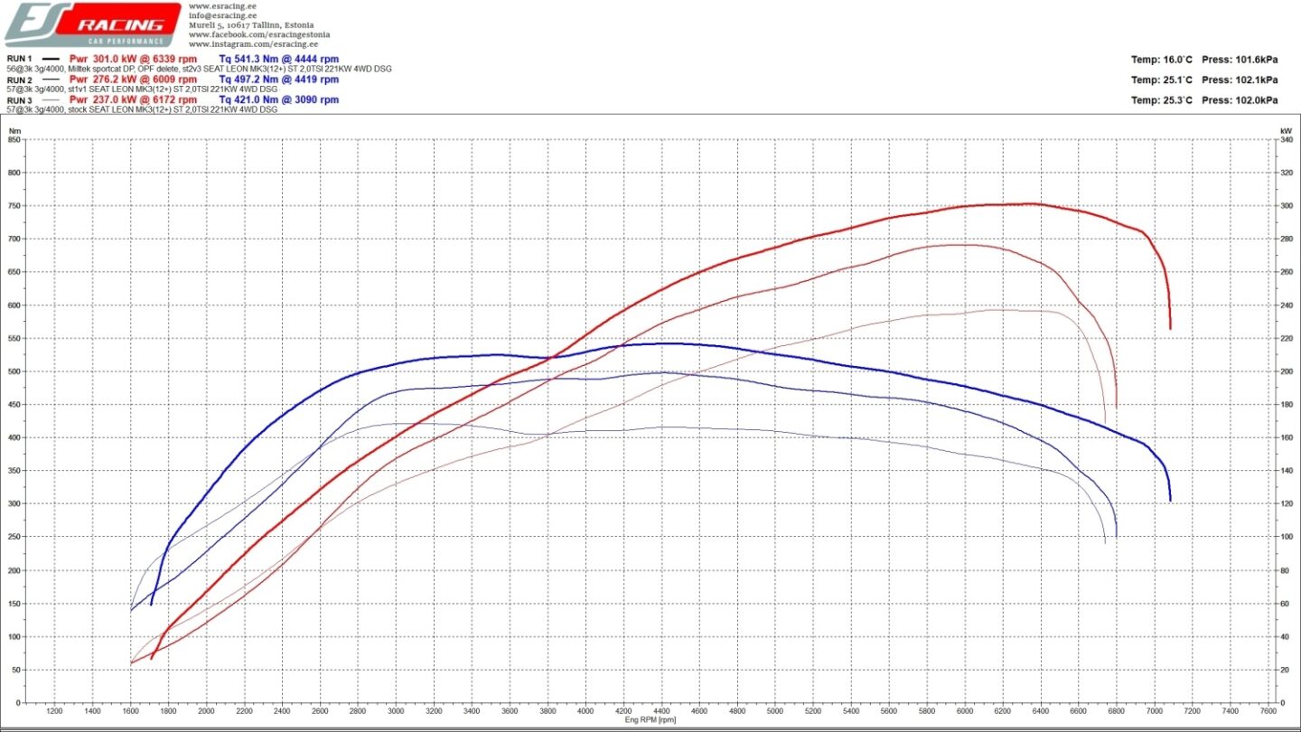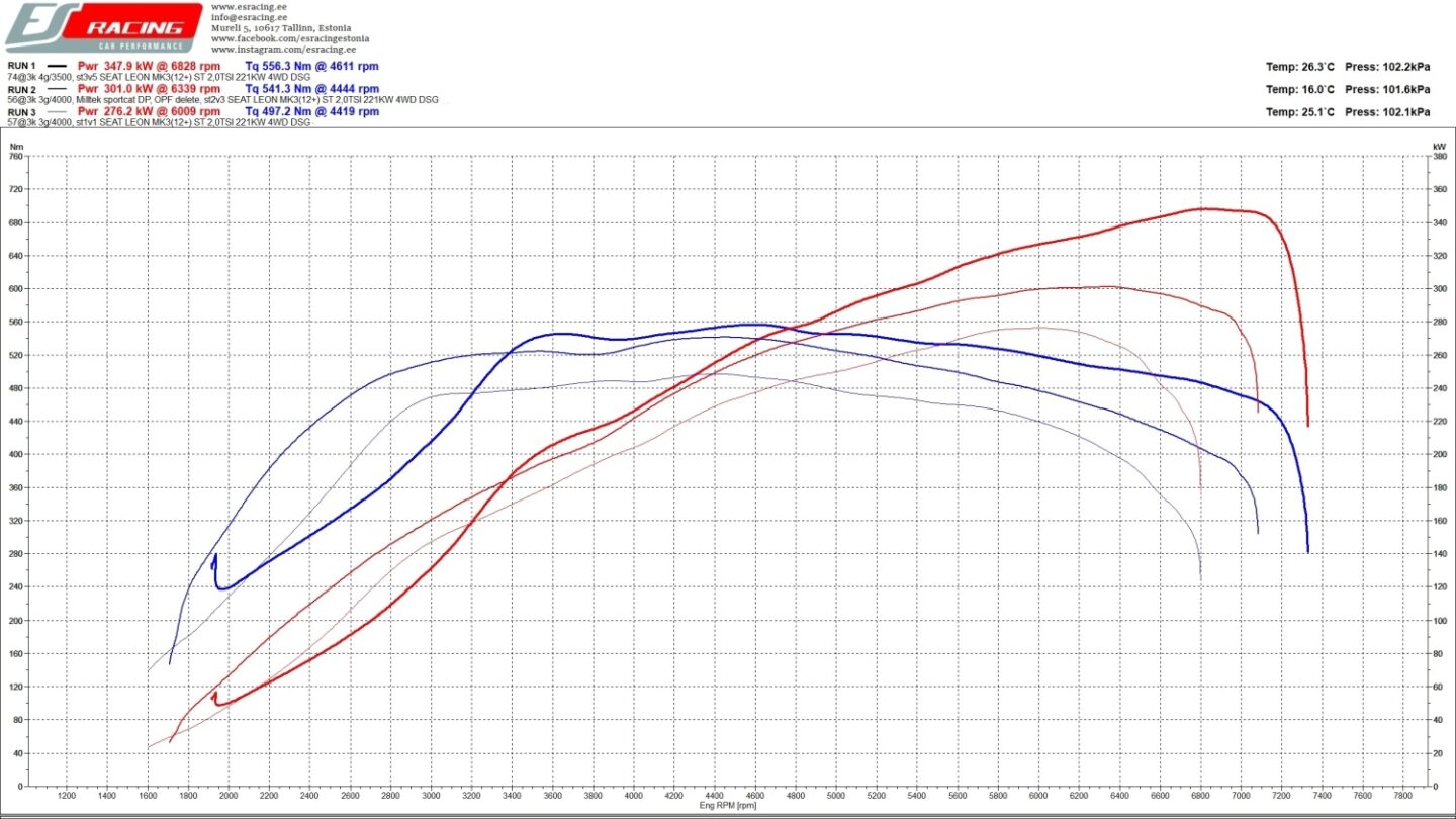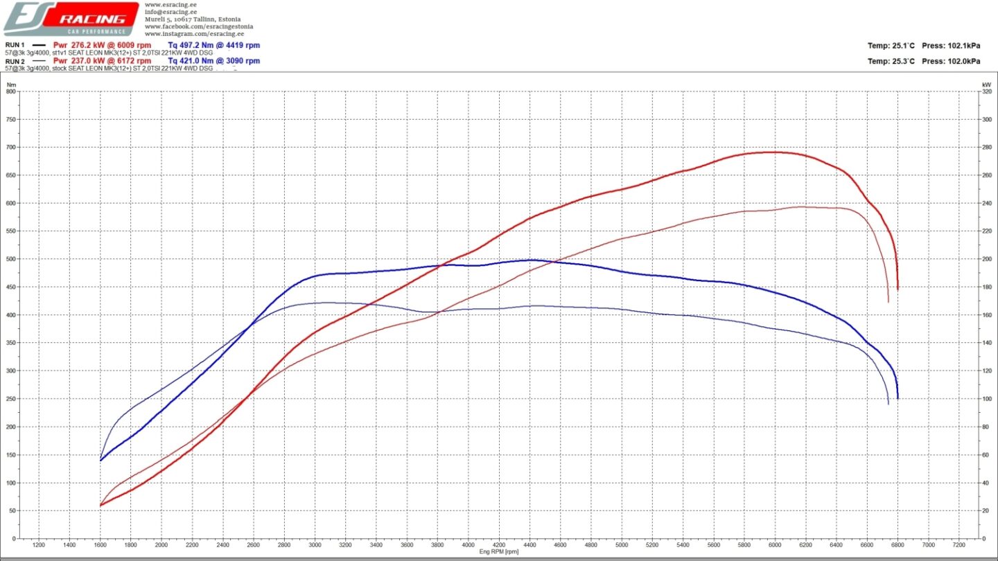 Peale neid muudatusi seadistame mootori ja kasti dünos, kütus ron98. Tavaliselt võrreldes stage1 tuninguga saab ca 20-25kW rohkem võimsust (graafik #2), oluliselt stabiilsema võimsuse tänu stabiilsema IAT’ile (eriti suvel soojema ilmaga ja pikematel kiirendustel), parema response’i ning parema väljalaske heli.