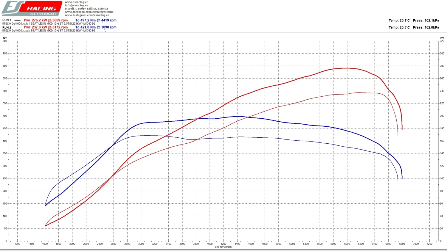 - Stage1. Täisoriginaal auto, 98 bensiin, mootori ja kasti tarkvara seadistamine dünos. Mõõdetud tulemus dünos 276kW ja 497Nm (Graafik #1. Sama auto), mõõdetud jõulisa võrreldes originaaliga +39kW ja +76Nm. Tavaliselt on need autod stage1 tuninguga teinud 270-275kW ja 490-510Nm.