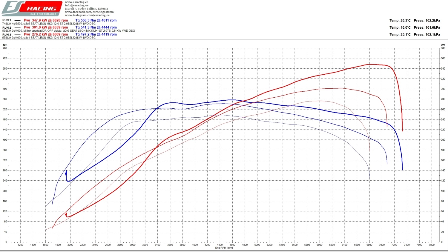 Peale neid muudatusi seadistame mootori ja kasti dünos, kütus ron98. Tavaliselt võrreldes stage1 tuninguga saab ca 20-25kW rohkem võimsust (graafik #2), oluliselt stabiilsema võimsuse tänu stabiilsema IAT’ile (eriti suvel soojema ilmaga ja pikematel kiirendustel), parema response’i ning parema väljalaske heli.